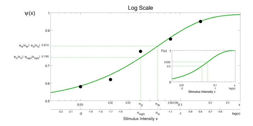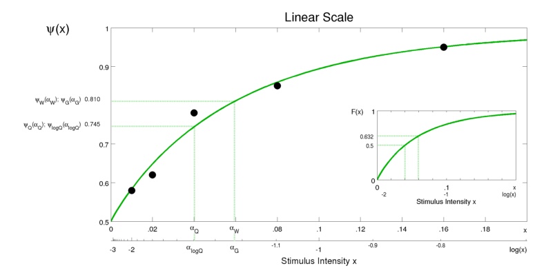 These four fits all correspond to one and the same psychometric function, namely the green curves in the figures below. Note that the fitted parameter values differ only in the value of the fitted threshold. The value of the threshold estimate for the Gumbel is simply the log-transform of the threshold estimate for the Weibull [log10(0.0594) = -1.226]. Thus the Weibull and the Gumbel are identical except that the Weibull uses a linear scale for contrast whereas the Gumbel uses a logarithmic scale. Similarly, the Quick and the logQuick functions are identical to each other except that the Quick operates on a linear scale but the logQuick operates on a logarithmic scale. The difference between the Weibull and Gumbel on the one hand and the Quick and the logQuick on the other is that, for the former pair, F (in the equation above) evaluates to 0.6321 (1 − e-1) at threshold whereas for the latter pair F evaluates to 0.5.