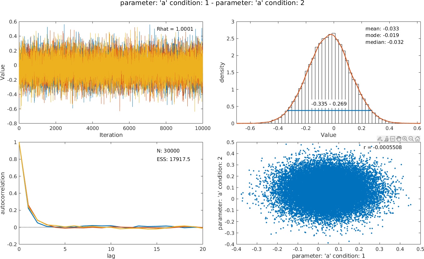 PAL_PFHB_inspectParam can still show posteriors for individual parameters, but can also be used to create posteriors for differences between parameters. E.g., want to know whether the location parameter differs between conditions 1 and 2? Use:>> PAL_PFHB_inspectParam(pfhb, 'a', 'condition', 1, 'a', 'condition', 2);