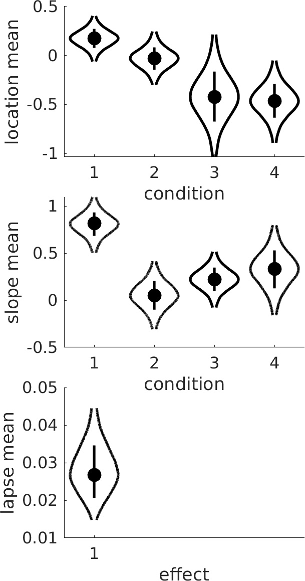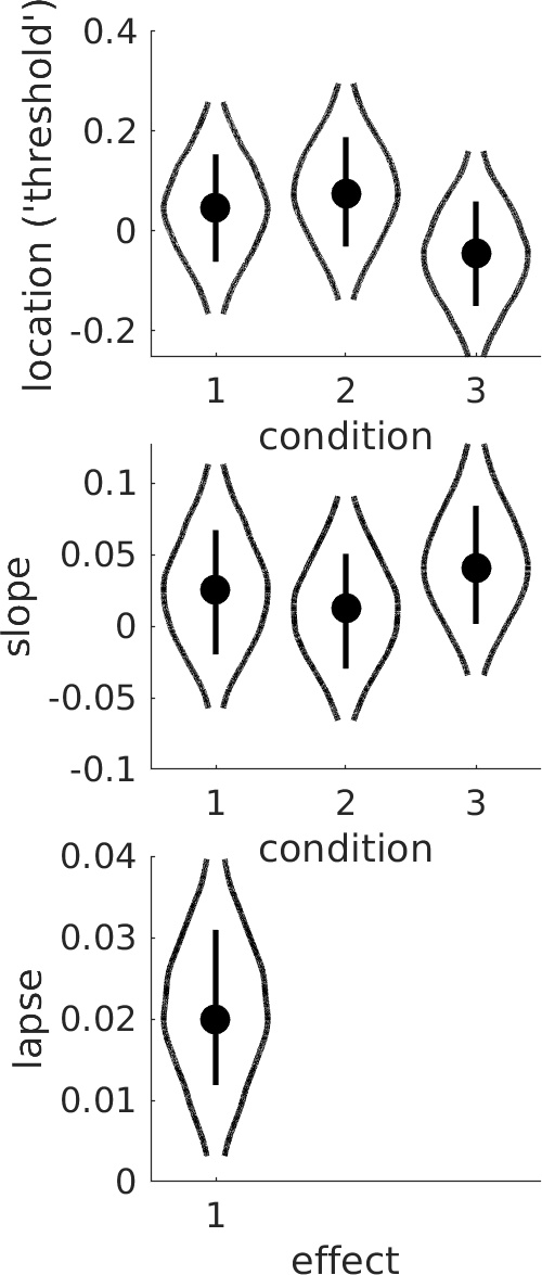 aka 'thresholds') and slope parameters to differ between the conditions but to constrain the lapse rates to be equal between the conditions. Since lapses by definition occur independently of the stimuli