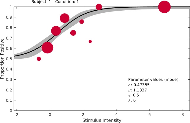Palamedes can fit multiple conditions and multiple observers simultaneously while giving considerable flexibility to specify models, but let's start with fitting a single PF.