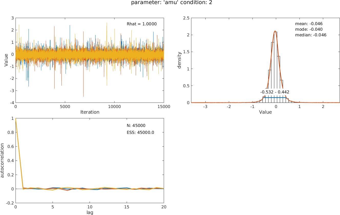 Figure 1. Posterior and diagnostic plots for the location hyper parameter in condition 2.