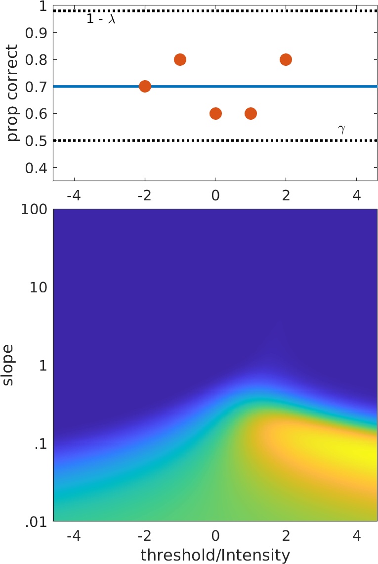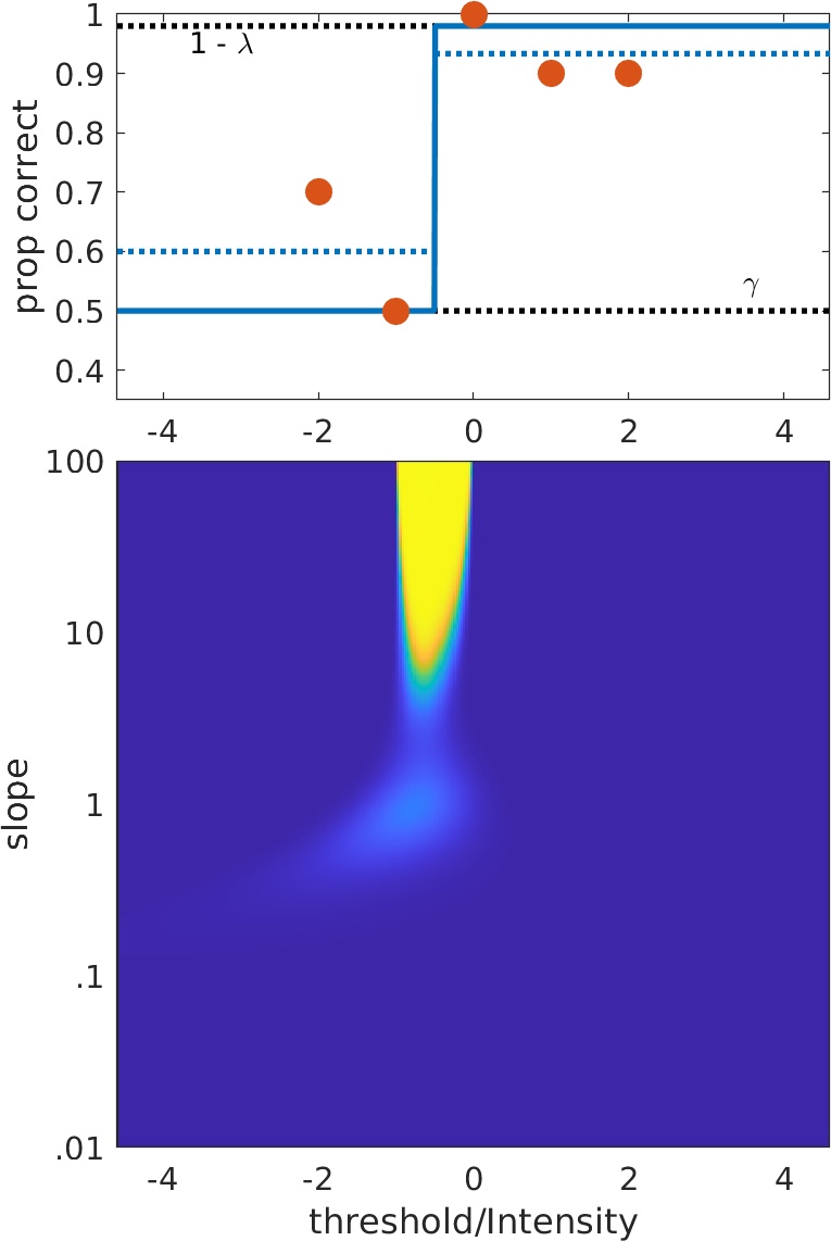 The best-fitting function for each will be revealed when you click the image! We've kept it easy: There are only five data points, both the guess and lapse rates are fixed, and all stimulus
