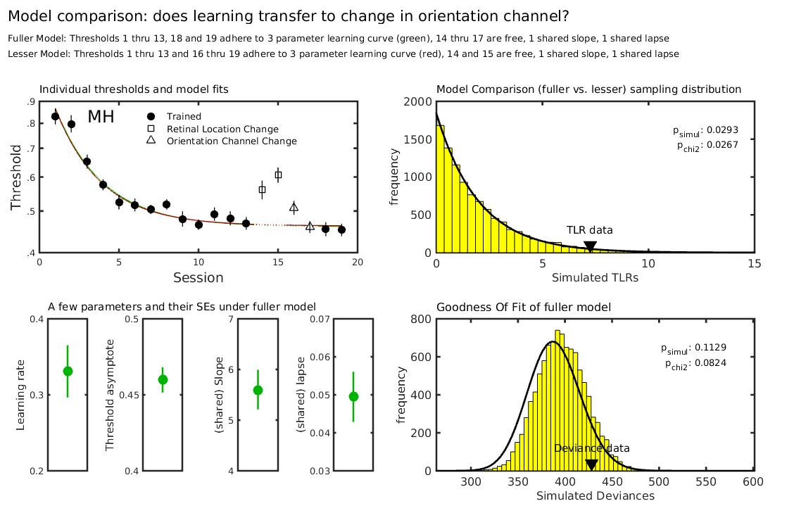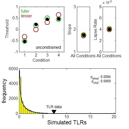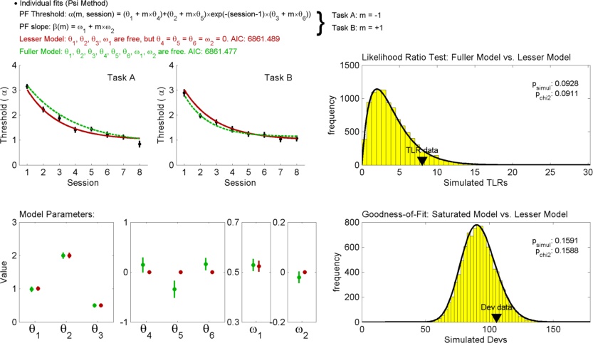 Fits two Psychometric Functions simultaneously and statistically compares models: