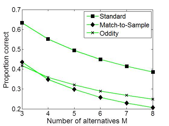 Proportion correct as a function of number of alternatives, M, for a d' (d-prime) of 1, for three different forced-choice tasks