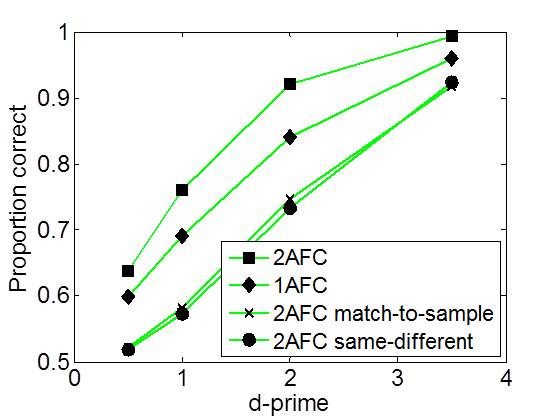 Proportion correct as a function of d' (d-prime) for four different tasks.