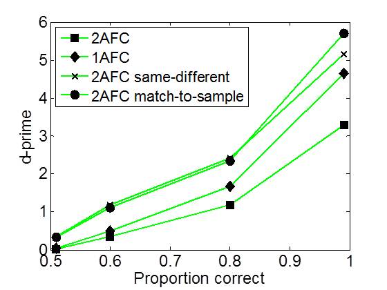 d' (d-prime) as a function of proportion correct for four tasks.