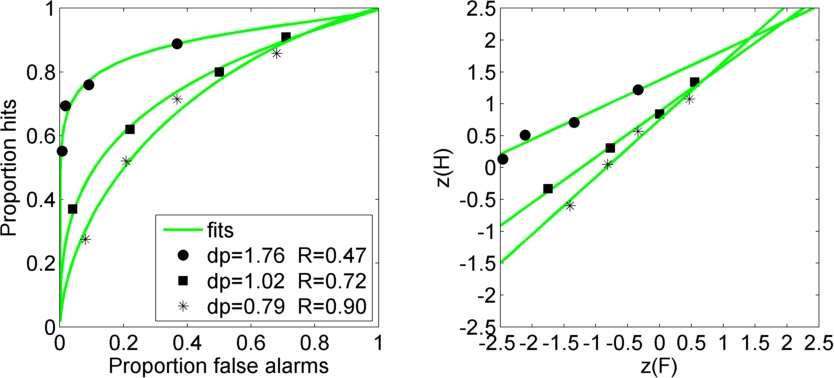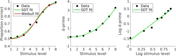 Shows the fit of an SDT model to a psychometric function.