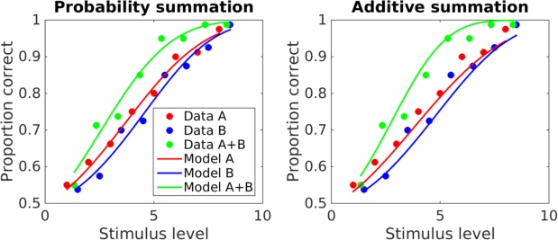 Shows fits of both additive and probability summation models to three psychometric functions.