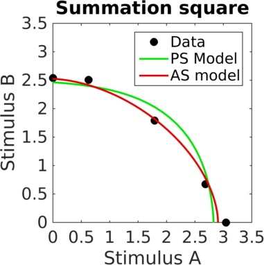 Shows the fit of both additive and probability summation models to five psychometric functions, with thresholds and model fits displayed in a summation square.