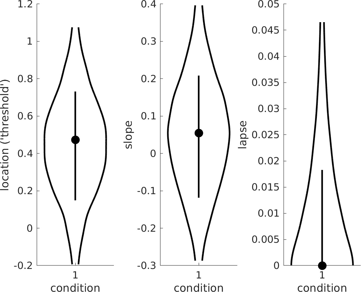 PAL_PFHB_inspectParam can still show posteriors for individual parameters, but can also be used to create posteriors for differences between parameters. E.g., want to know whether the location parameter differs between conditions 1 and 2? Use:>> PAL_PFHB_inspectParam(pfhb, 'a', 'condition', 1, 'a', 'condition', 2);
