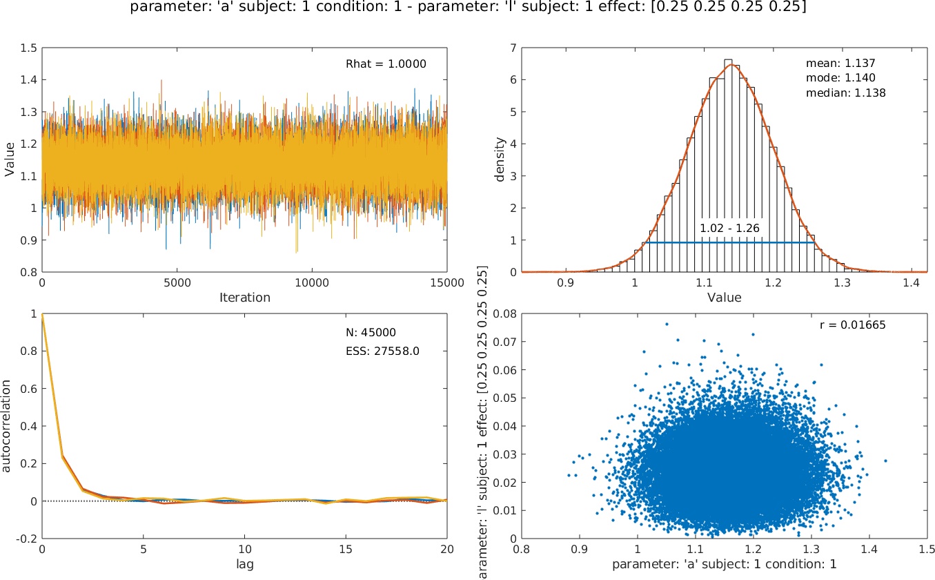 Figure 2. Posterior for the difference between the location parameter of subject 1 in condition 1 and the lapse rate parameter of subject 1. The bottom right graph shows a scatterplot between these two parameters and the correlation coefficient. Parameters that show a high correlation can be problematic.