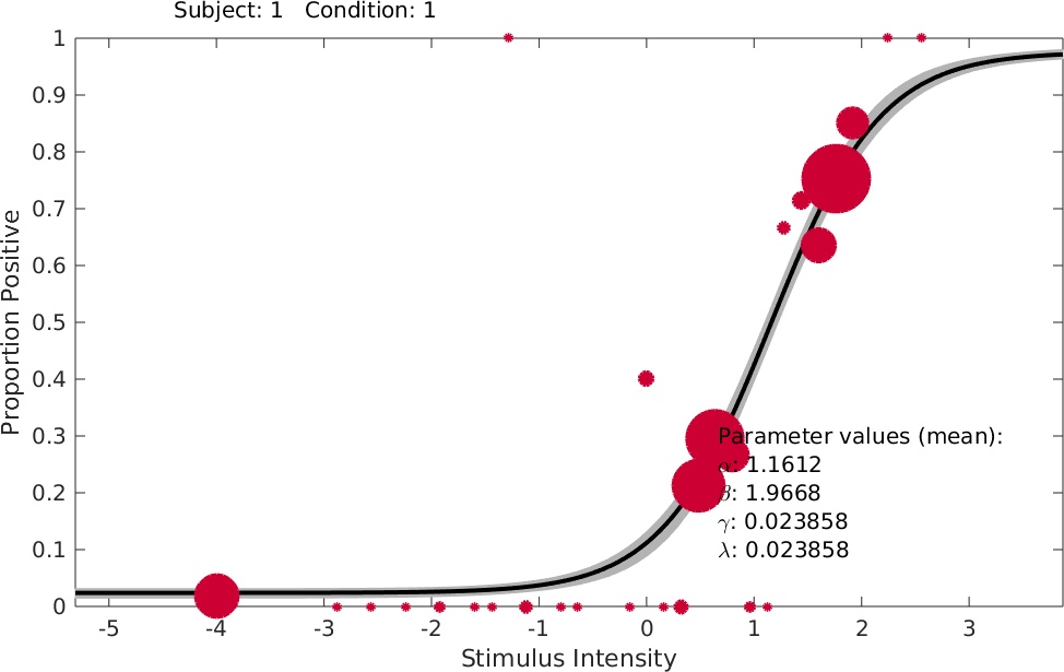 PAL_PFHB_MultipleSubjectsandConditions_Demo: Hierarchical Bayesian fitting of psychometric functions obtained from multiple subjects testing in multiple conditions. Visit our