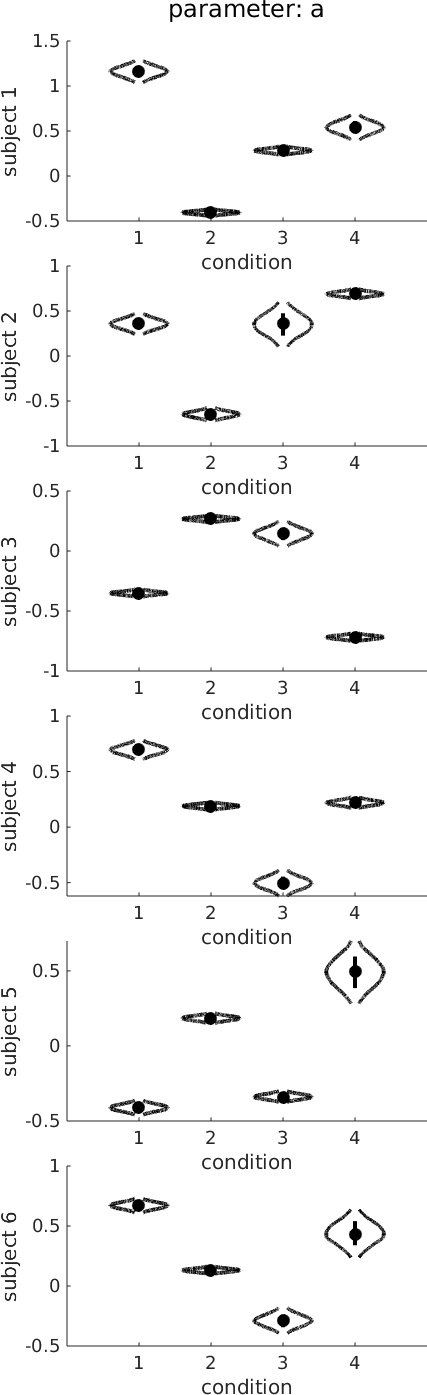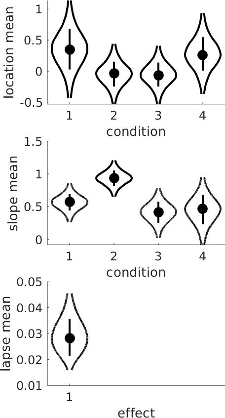 Figure 4. Violin plot for hyper-parameters. Note that by default one lapse rate is estimated per subjects, effectively assuming that lapse rates do not differ between conditions (but may differ between subjects).