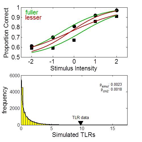 Figure 4. Model comparison: Individual thresholds and slopes versus individual thresholds and common slope (i.e., are slopes different?)