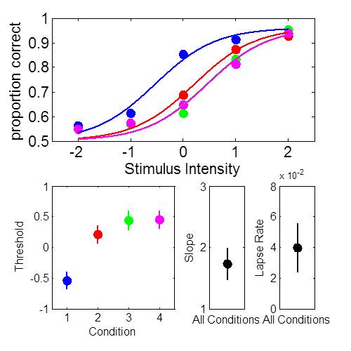 Figure 1. Four conditions fitted with individual thresholds, common (but fitted) slope and lapse rate (guess rate fixed at 0.5). This is a 6 parameter (4 thresholds, 1 slope, 1 lapse rate) model.