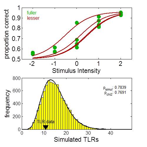 Figure 2. Model comparison. Model shown in Figure 1 (4 thresholds, 1 slope, 1 lapse rate) versus model with shared threshold (1 threshold, 1 slope, 1 lapse rate). I.e., are thresholds differences 'statistically reliable'?